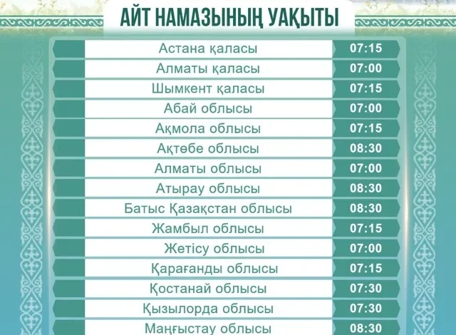 Ал Қостанай, Қызылорда және Ұлытау облыстарында айт намазы сағат 07:30-да оқылады.